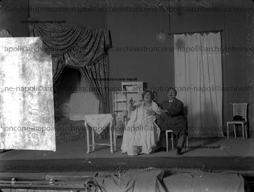 Questa foto mostra una scena da uno spettacolo non identificato. Al centro dell’immagine due attori sono seduti su delle sedie. A sinistra è seduto quello che sembra essere una donna interpretato da un uomo, con un’espressione esagerata e la bocca aperta, indossa un abito chiaro e ampio. L’uomo, seduto accanto a lei, indossa un abito elegante. Lo sfondo riproduce una camera da letto. Si vedono delle tende drappeggiate, un letto, dei mobili e altre sedie. Attori non identificati.
