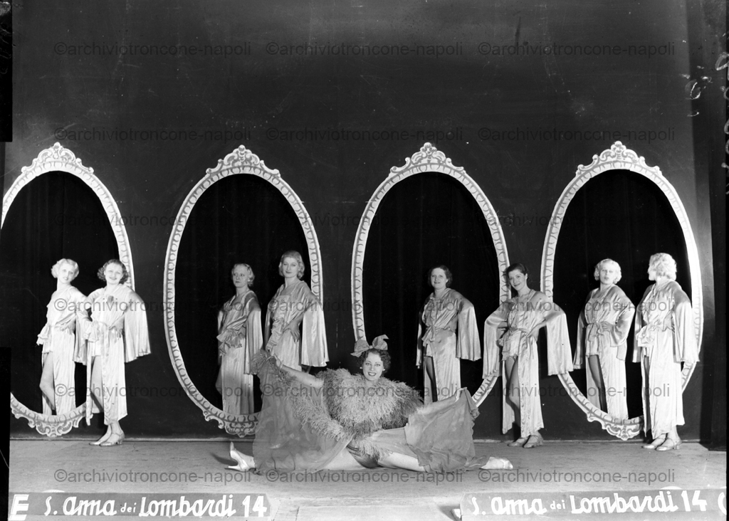 La foto mostra un gruppo di nove donne sul palco. La scenografia è composta da uno sfondo scuro con quattro grandi cornici ovali che danno l’illusione di sembrare specchi. In primo piano, una donna fa la spaccata. Indossa un abito sfarzoso con piume e un copricapo. Dietro di lei, le altre donne sono in piedi, 2 per ogni specchio posizionate in modo tale da sembrare una il riflesso dell’altra allo specchio. Tutte indossano degli abiti simili, che sembrano essere delle vestaglie leggere e fluide. Attrici non identificate.