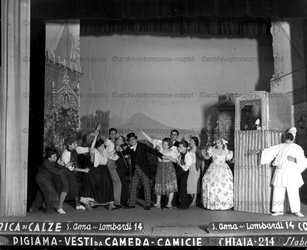 Questa foto mostra una scena con numerosi personaggi. Il palco è occupato da un gruppo di persone in un’ambientazione che sembra una piazza o una strada. In primo piano c’è un personaggio vestito da Pulcinella che, con il suo abito bianco e la maschera nera, si staglia sulla destra. Il suo braccio è teso in un gesto espressivo. Al centro, la scena è molto dinamica. Un uomo al centro, vestito con un abito a quadri, è circondato da una folla di altri attori che lo tocca, lo tirano e sembrano interagire con lui. Probabilmente divide in due parti il gruppo he sembra star litigando. La donna con l’abito floreale chiaro si trova a destra del gruppo, con un’espressione agitata. La scenografia è dettagliata e dipinta, raffigurando un paesaggio urbano con edifici e quello che sembra essere il Vesuvio sullo sfondo, suggerendo insieme alla presenza di pulcinella che la scena è ambientata a Napoli. Sul lato destro del palco, si nota una struttura a strisce bianche e nere che sembra un teatrino per burattini. Attori in scena non identificati.