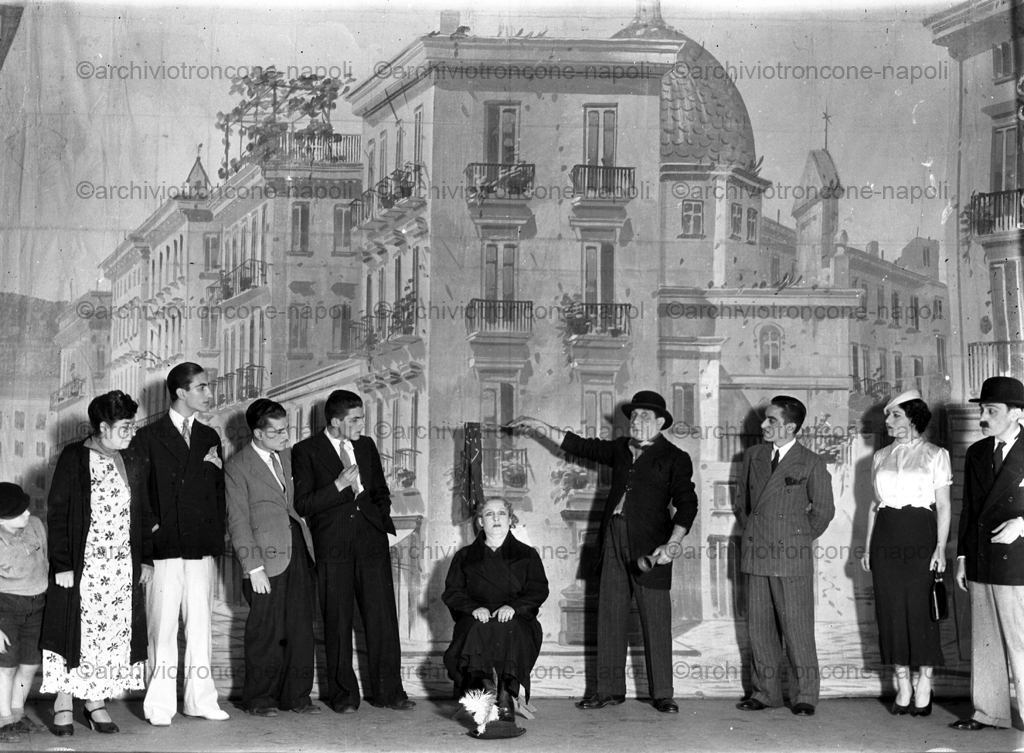 La scena mostra una scena di gruppo ambientata su di una strada. Il fondale dipinto rappresenta un quartiere urbano con edifici a più piani e una cupola visibile sulla destra: esso evoca l’architettura classica di una città itali. In scena ci sono dieci persone, posizionate in diversi gruppi. A sinistra, un gruppo di cinque persone (quattro adulti e un bambino) sono in piedi e guardano verso il centro del palco. Al centro, una donna è seduta su una sedia e guarda di fronte a lei. Alla sua destra, un gruppo di tre uomini e una donna sono disposti in fila, osservando l’interazione tra i personaggi al centro. Un uomo con una bombetta e un abito scuro, posizionato alla destra della donna seduta sventola qualcosa sul capo della donna. Attori non identificati,