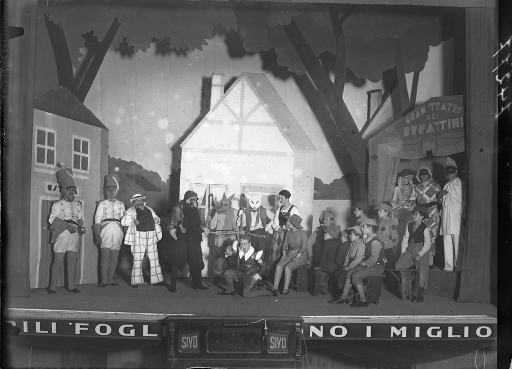 Nella foto sono presenti vari personaggi, tra cui anche dei bambini. Al Centro vediamo due personaggi che indossano abiti che rimandano a figure animalesche: probabilmente essi interpretano Il ‘’gatto e la volpe’’ della storia di Pinocchio. Davanti a loro,, in ginocchio è presente quello che sembra proprio essere il personaggio di Pinocchio. Gli altri personaggi sembrano guardare il centro della scena dove si svolge l’azione. Sulla destra è presente un gruppo di bambini. Dietro ai bambini vediamo tre personaggi adulti, i quali sembrano essere Colombina, Arlecchino e Pulcinella Essi sono posti in un livello più alto rispetto agli altri personaggi su quello che sembra essere un palco. Difatti sopra di loro si trova un’insegna con scritto ”Gran Teatro dei burattini”. Sulla sinistra della scena invece vi sono altri personaggi: due guardie, un uomo con un completo a scacchi e un uomo con un costume non riconoscibile. La scenografia rappresenta quello che sembra essere la strada di un piccolo paese come si può notare dalle case e dagli alberi dipinti sulla scenografia. Attori in scena non identificati