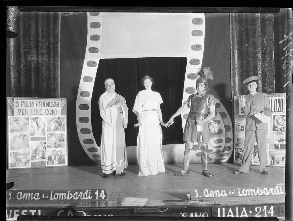 In questa foto, quattro attori sono in posa su un palco. La scenografia principale è un grande rullo di pellicola cinematografica con al centro un’apertura. Ai lati, ci sono dei pannelli che mostrano delle locandine cinematografiche. Una delle scritte recita “3 FILM FRANCESI PER LIRE 0.10”, il che suggerisce un’ambientazione legata al cinema. Da sinistra troviamo un uomo in costume che ricorda un’antica toga. Al suo fianco una donna vestita con una toga, che sta tenendo la mano di un uomo vestito da soldato romano. Infine un uomo in uniforme che tiene in mano dei fogli. Attori in scena non identificati.
