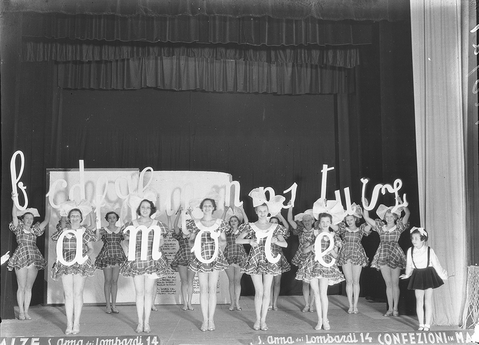 In questa foto, un gruppo di donne vestite con abiti a quadri sono in posa su un palco, dietro di loro c’è un sipario scuro e un grande libro aperto. Ogni donna sta tenendo una grande lettera che. È leggibile in primo piano la scritta ‘’amore”. Le donne sono disposte in modo che le lettere siano visibili, formando la scritta. Sulla destra c’è una bambina che indossa un costume simile. Attrici non identificate.