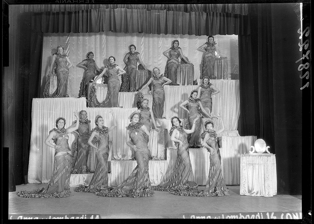 In questa foto, un numeroso gruppo di donne è in posa su un palco con una scenografia a più livelli. La scalinata a piramide serve come base per la coreografia, creando una struttura geometrica. Le donne indossano abiti lunghi eleganti, con strascichi e scollature elaborate. Spicca la donna centrale in prima fila che presenta un accessorio in più: un ciondolo a forma di rombo luccicante. La sua posizione e questo dettaglio le donano un aspetto da protagonista. Sulla destra, c’è un tavolino coperto con un panno e uno specchio. Attrici in scena non identificate.