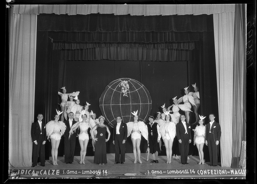 Sul palco sono presenti uomini e donne. Le donne in particolare indossano dei costumi che sono composti da piume, e sul capo presentano la sagoma di una colomba; Potremmo ipotizzare che esse impersonificano le colombe, simbolo della pace. Verso sinistra vi è una donna che invece indossa un abito lungo elegante. Tra le varie donne vi sono anche alcuni uomini che sono vestiti in maniera elegante, fatta eccezione per un uomo sulla sinistra che presenta un costume differente. Sullo sfondo troviamo l’immagine stilizzata del mondoAttori non identificati.