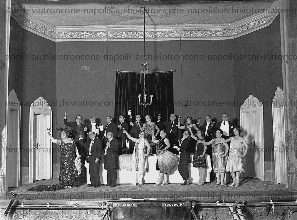Teatro Nuovo, Compagnia Salvietti. Nella scena troviamo un gruppo di personaggi. Tutti gli attori indossano abiti eleganti e tengono tra le mani un calice che sono in procinto di alzare, come se stessero svolgendo un brindisi. Il secondo a sx, in alto è Agostino Salvietti; non identificati gli altri attori e lo spettacolo.