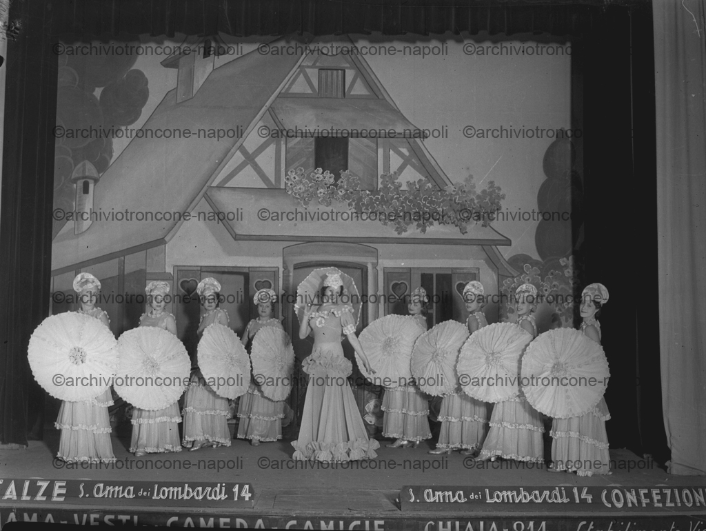 In questa foto, la scena è ambientata di fronte a una scenografia dipinta che raffigura una casa in stile chalet con fiori che sporgono da una finestra al piano superiore. Sul palco ci sono nove donne che indossano abiti simili. Esse sono disposte a semicerchio, hanno degli ombrellini aperti che coprono il loro busto. Al centro della scena, una donna con un vestito più elaborato si distingue dalle altre. Indossa un grande cappello e tiene l’ombrello alzato dietro al capo. Il suo abbigliamento suggerisce che ricopra un ruolo più importante nello spettacolo. Attrici in scena nono identificate.