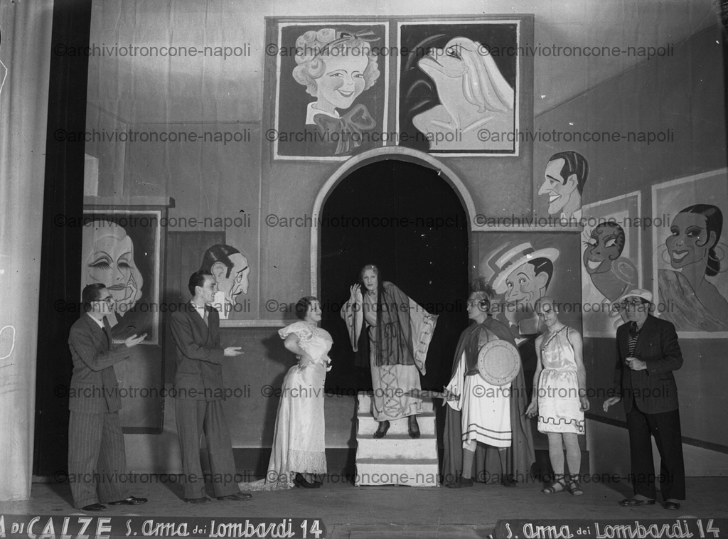 In questa foto, la scena è ambientata di fronte a una scenografia che richiama una galleria d’arte o un’esposizione di ritratti e caricature. I ritratti mostrano diversi volti stilizzati, alcuni dei quali sembrano personaggi famosi o figure tipiche dell’epoca. Sul palco ci sono diversi attori in abiti formali e in costume. A sinistra, due uomini vestiti con abiti eleganti sono girati verso destra. Dopo di loro vi è una donna che indossa un abito elegante e anche lei è girata verso destra. Al centro, una donna in piedi su dei gradini indossa abiti particolari e si sporge verso sinistra. A destra sono presenti altri tre personaggi: Due uomini con costumi particolari che sembrano voler ricordare personaggi dell’antica Roma, E infine vi è un uomo con un capello e un abito elegante. Attori in scena non identificati.