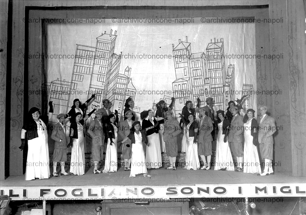 La foto mostra una scena di gruppo dallo spettacolo ”Tutto speciale da quello” presso il teatro Nuovo. Nella scena sono presenti uomini e donne posti in maniera alterna sulla scena. I costumi sono uguali tra loro: tutti gli uomini indossano un abito a quadretti e hanno una pipa tra le labbra e tutte le donne indossano un abito lungo elegante con una stola sulle spalle. Tutti gli attori puntano un braccio verso l’alto come se indicassero la scenografia che mostra una serie di palazzi molto alti. Attori in scena non identificati.