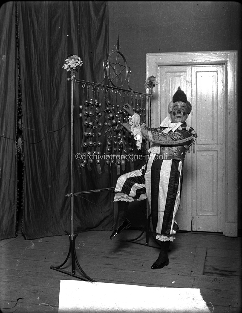 Nella foto viene immortalato in un ritratto a figura intera di Vincenzo Scarpetta mentre indossa abiti da pagliaccio. Vincenzo Scarpetta (Napoli, 19 giugno 1877 – Napoli, 3 agosto 1952) è stato un attore, regista, commediografo e compositore italiano e pioniere del cinema napoletano e italiano. Figlio di Eduardo Scarpetta, era fratellastro di Eduardo De Filippo, Peppino De Filippo e Titina De Filippo.